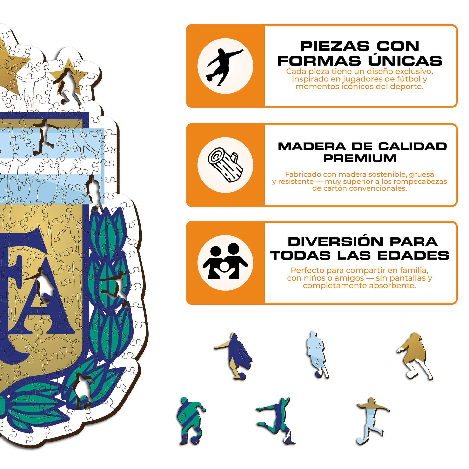 ✓ Cada pieza del rompecabezas tiene una forma única que representa elementos relacionados con el fútbol y poses de jugadores icónicos.